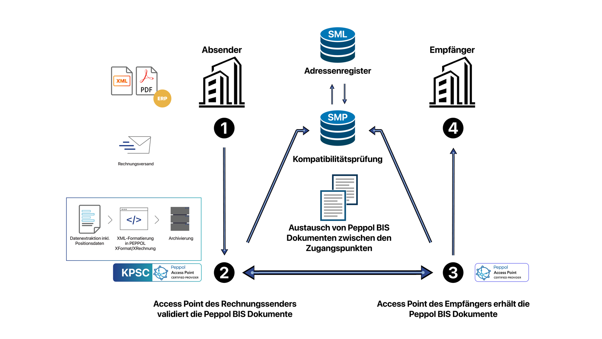 Die KPSC ist bereits ein PEPPOL Access Point und kann somit die globale Entwicklung zum standardisierten Rechnungsaustausch unterstützen. Damit werden Rechnungen über die KPSC- Lösung problemlos innerhalb des PEPPOL Netzwerks versendet und empfangen.