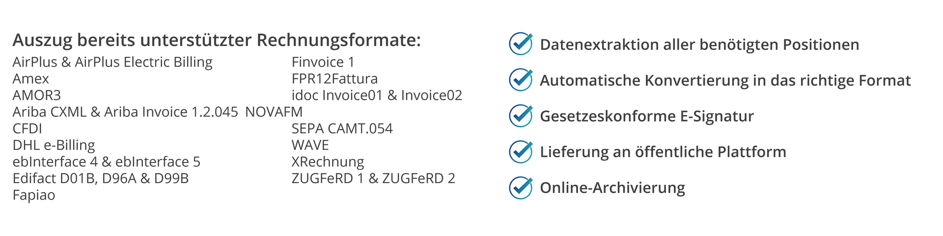 KPSC unterstützt bei der Verarbeitung elektronischer Rechnungen in Übereinstimmung mit den einzigartigen Spezifikationen der europäischen Länder. Dazu gehört die Verarbeitung aller Formate (z. B. PDF, XRechnung, xFormat, usw.), sowie die Kommunikation mit PA-Plattformen (PEPPOL) , um elektronische Rechnungen mit Statusaktualisierungen zu versenden und die elektronischen Rechnungen gesetzlich konform zu archivieren.